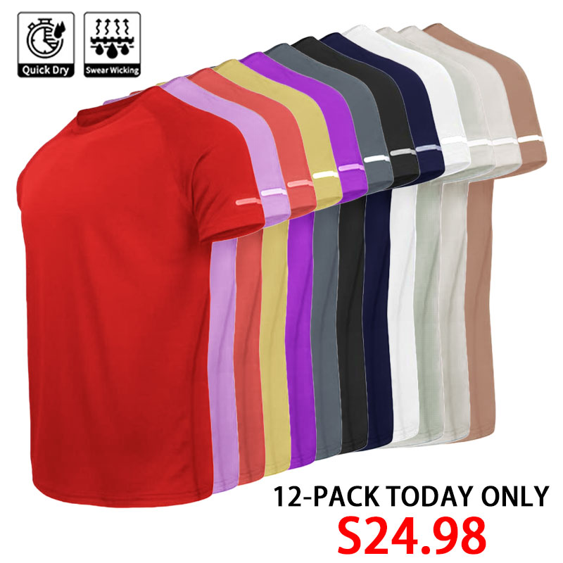 🔥12-Pack Men's Plain Reflective Design Sports Tee, Breathable Quick Drying Short Sleeve T-shirt
