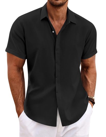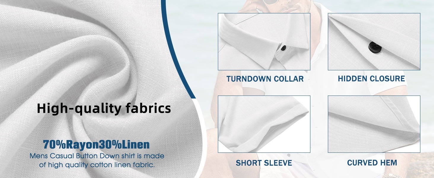 Men's casual linen shirt features button closure, short sleeves, adjustable cuffs, slim fit, and solid color. Casual beach style design makes you feel better this summer