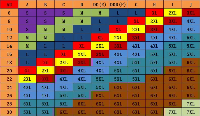 • Sizes : S, M, L, XL, XXL, 3XL, 4XL, 5XL, 6XL (fits for 28A to 48J)